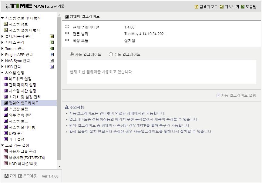 EFM, ipTIME NAS dual시리즈/4/2e 제품 신규 펌웨어 업데이트 2021.05.06 17:37 ETC.Mobile/Nas.HomeLab 반응형 EFM의 홈페이지에 자사의 ipTIME NAS daul시리즈 및 기존 4/2e 제품군의 신규 펌어웨 1.4.68 버전이 등록되었습니다. dual시리즈에 미리 업데이트되었던 기능이 2e/4 제품에 적용되며(소켓 버퍼 설정 옵션 추가 등), 전 제품 이전 베타 버전 펌웨어에 적용되었던 ipCAM 서비스 녹화영상 병합 기능 추가 및 외부 접속 관리 알고리즘 변경 및 스토리지 온도 알고리즘 변경이라고 하니 참조하세요. 반응형 공유하기 게시글 관리 Klein Berry 'ETC.Mobile > Nas.HomeLab' 카테고리의 다른 글 EFM, ipTIME NAS dual 시리즈 1.4.69 베타 펌웨어 (0) 2021.05.23 EFM, ipTIME NAS dual 제품군, NAS2e, NAS4 베타 펌웨어 1.4.67 (0) 2021.04.26 EFM, ipTIME NAS dual 시리즈 펌웨어 1.4.66 업데이트 (0) 2021.04.15 댓글 공유하기 다른 글 댓글 이 글 공유하기 구독하기 구독하기 카카오톡 카카오톡 라인 라인 트위터 트위터 Facebook Facebook 카카오스토리 카카오스토리 밴드 밴드 네이버 블로그 네이버 블로그 Pocket Pocket Evernote Evernote 다른 글 시놀로지 DSM 7.0 RC-41882 공개 시놀로지 DSM 7.0 RC-41882 공개 2021.06.03 EFM, ipTIME NAS dual 시리즈 1.4.69 베타 펌웨어 EFM, ipTIME NAS dual 시리즈 1.4.69 베타 펌웨어 2021.05.23 EFM, ipTIME NAS dual 제품군, NAS2e, NAS4 베타 펌웨어 1.4.67 EFM, ipTIME NAS dual 제품군, NAS2e, NAS4 베타 펌웨어 1.4.67 2021.04.26 EFM, ipTIME NAS dual 시리즈 펌웨어 1.4.66 업데이트 EFM, ipTIME NAS dual 시리즈 펌웨어 1.4.66 업데이트 2021.04.15 다른 글 더 둘러보기