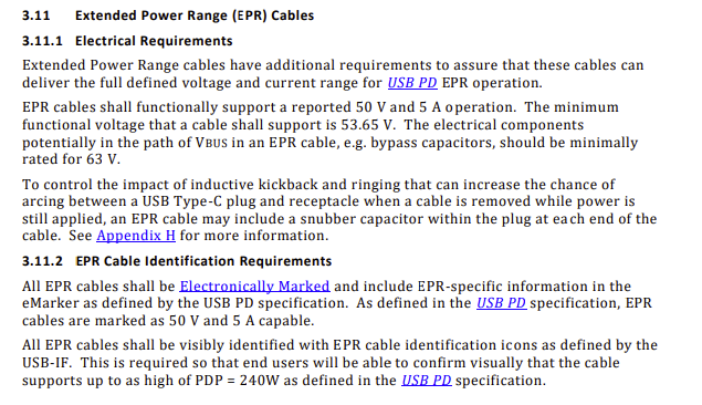 USB Type-C의 전원 공급을 240W로 올린 USB PD EPR 2021.05.26 19:33 PC.Div.Soft/News 반응형 USB Type-C 사양 2.1 리비전이 발표되었습니다. USB-IF의 발표에 따르면 이번 2.1 개정에서 48V 전압을 새롭게 추가해, USB Type-C로 공급 가능한 전력이 100W에서 240W로 늘어났다고 하네요. 지금까진 20V/5A가 최대였지만 이번에 추가된 규격입니다. 이를 사용하려면 최대 50V까지 버틸 수 있는 USB PD Extended Power Range(EPR)규격을 준수하는 케이블이 필요하다고 하니 참조하시길. 반응형 공유하기 게시글 관리 Klein Berry 'PC.Div.Soft > News' 카테고리의 다른 글 D5 Render 1.9 출시 (0) 2021.05.28 AMD 소켓 AM5 패키지 밑면 사진 유출 (0) 2021.05.26 Google, Chrome 브라우저 91.0.4472.77 출시 (0) 2021.05.26 댓글 공유하기 다른 글 댓글 이 글 공유하기 구독하기 구독하기 카카오톡 카카오톡 라인 라인 트위터 트위터 Facebook Facebook 카카오스토리 카카오스토리 밴드 밴드 네이버 블로그 네이버 블로그 Pocket Pocket Evernote Evernote 다른 글 ASUS, ROG CH VIII시리즈용 AMD AGESA 1.2.0.3 베타 BIOS ASUS, ROG CH VIII시리즈용 AMD AGESA 1.2.0.3 베타 BIOS 2021.05.28 D5 Render 1.9 출시 D5 Render 1.9 출시 2021.05.28 AMD 소켓 AM5 패키지 밑면 사진 유출 AMD 소켓 AM5 패키지 밑면 사진 유출 2021.05.26 Google, Chrome 브라우저 91.0.4472.77 출시 Google, Chrome 브라우저 91.0.4472.77 출시 2021.05.26 다른 글 더 둘러보기
