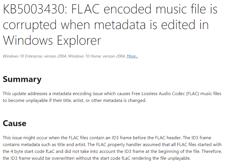 MS가 Windows 10(버전 2004~)의 파일 탐색기에서 FLAC 파일의 메타 데이터를 편집하면 파일이 재생되지 않는 문제가 있음을 발견했다고 합니다. FLAC Property Handler의 오작동으로 곡명이나 아티스트 등의 메타 데이터를 탐색기에서 편집하면 일부 파일을 재생할 수 없게 되어버린다고 하네요. 이 문제는 KB5003214 업데이트 프리뷰에서 해결되었다고 합니다.