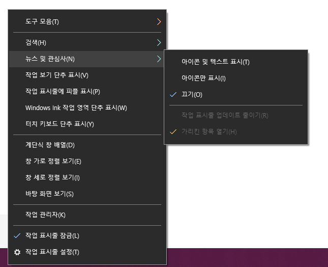 윈도10의 뉴스 및 관심사 메뉴를 끄는 경우에도 일부 문제가 해결되기도 한다고 하니 참조하세요.