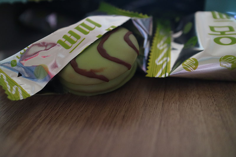다만. 디저트이긴 하지만 칼로리는 메인 요리 수준; 색상 잘 뽑은 것 같다. 참. 첨가물에는 소비톨 들어간다고 되어 있다. 이런거에 예민한 분들은 참고하시길. 개별 포장은 은박에 연두색.