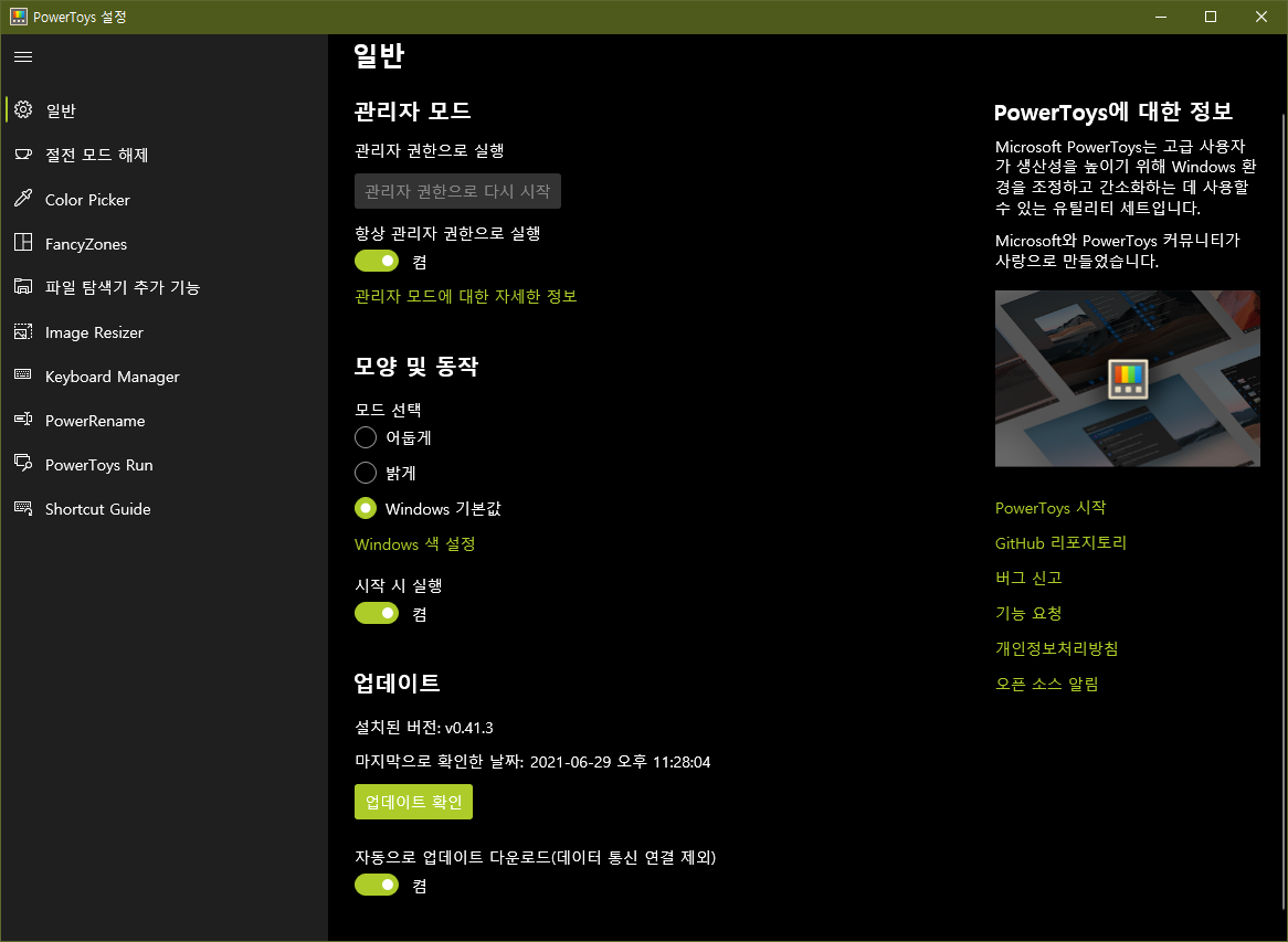 윈도10용 PowerToys 0.41.3 업데이트 2021.06.29 23:29 PC.Div.Soft/Windows.Office 반응형 윈도10용 PowerToys가 안정성 개선 및 버그가 수정되었다고 합니다. 사용하고 계신 분들은 업데이트를 한 번 챙겨보세요. 반응형 공유하기 게시글 관리 Klein Berry 'PC.Div.Soft > Windows.Office' 카테고리의 다른 글 윈도11, 동적 화면 재생률 지원(노트북) (0) 2021.06.30 Microsoft, Windows 11 최소 시스템 요구 사항 완화 (0) 2021.06.29 Microsoft, Windows 11 정식 발표 (0) 2021.06.25 댓글 공유하기 다른 글 댓글 이 글 공유하기 구독하기 구독하기 카카오톡 카카오톡 라인 라인 트위터 트위터 Facebook Facebook 카카오스토리 카카오스토리 밴드 밴드 네이버 블로그 네이버 블로그 Pocket Pocket Evernote Evernote 다른 글 Windows 11, 접근성 기능 개선 Windows 11, 접근성 기능 개선 2021.07.03 윈도11, 동적 화면 재생률 지원(노트북) 윈도11, 동적 화면 재생률 지원(노트북) 2021.06.30 Microsoft, Windows 11 최소 시스템 요구 사항 완화 Microsoft, Windows 11 최소 시스템 요구 사항 완화 2021.06.29 Microsoft, Windows 11 정식 발표 Microsoft, Windows 11 정식 발표 2021.06.25 다른 글 더 둘러보기