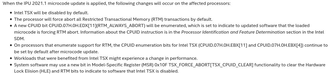그리고 신규 마이크로코드가 나오고 얼마 뒤 백서가 나왔고, 여기에 관련 언급이 있다고 합니다. 하스웰 때 추가했다가 비활성화한 전적이 있어서 이번이 처음이 아니지만, 이번에는 7,8세대 프로세서에 이르기까지 이 기능이 비활성화되는 이야기라 이러한 부분을 장점으로 광고해왔던 만큼, 출시하고 나서 비활성화하는 건 질타를 듣지 않나 싶습니다.