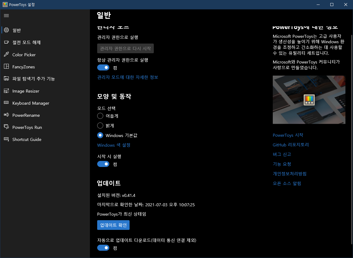 Windows 10 PowerToy, 0.4.14 업데이트 2021.07.03 22:07 PC.Div.Soft/Windows.Office 반응형 PowerToys가 v0.41.4 버전이 되었습니다. 요번 주 잦은 업데이트가 있는데요, 이번 버전에서 Awake 기능 구현에 따른 CPU 부하가 높아지는 문제를 수정했다고 합니다. 그리고 몇 가지 옵션도 추가했다고 하네요. 그리고 이번 버전에서 Run(검색)문제, FancyZones가 올바르게 시작되지 않는 문제 등도 수정되었다고 하니 사용하는 분들은 업데이트를 챙겨보세요. 반응형 공유하기 게시글 관리 Klein Berry 'PC.Div.Soft > Windows.Office' 카테고리의 다른 글 Windows 10, PrintNightmare 패치 (0) 2021.07.07 Windows 11, 접근성 기능 개선 (0) 2021.07.03 윈도11, 동적 화면 재생률 지원(노트북) (0) 2021.06.30 댓글 공유하기 다른 글 댓글 이 글 공유하기 구독하기 구독하기 카카오톡 카카오톡 라인 라인 트위터 트위터 Facebook Facebook 카카오스토리 카카오스토리 밴드 밴드 네이버 블로그 네이버 블로그 Pocket Pocket Evernote Evernote 다른 글 Windows 11, 빌드 22000.65 배포 Windows 11, 빌드 22000.65 배포 2021.07.11 Windows 10, PrintNightmare 패치 Windows 10, PrintNightmare 패치 2021.07.07 Windows 11, 접근성 기능 개선 Windows 11, 접근성 기능 개선 2021.07.03 윈도11, 동적 화면 재생률 지원(노트북) 윈도11, 동적 화면 재생률 지원(노트북) 2021.06.30 다른 글 더 둘러보기