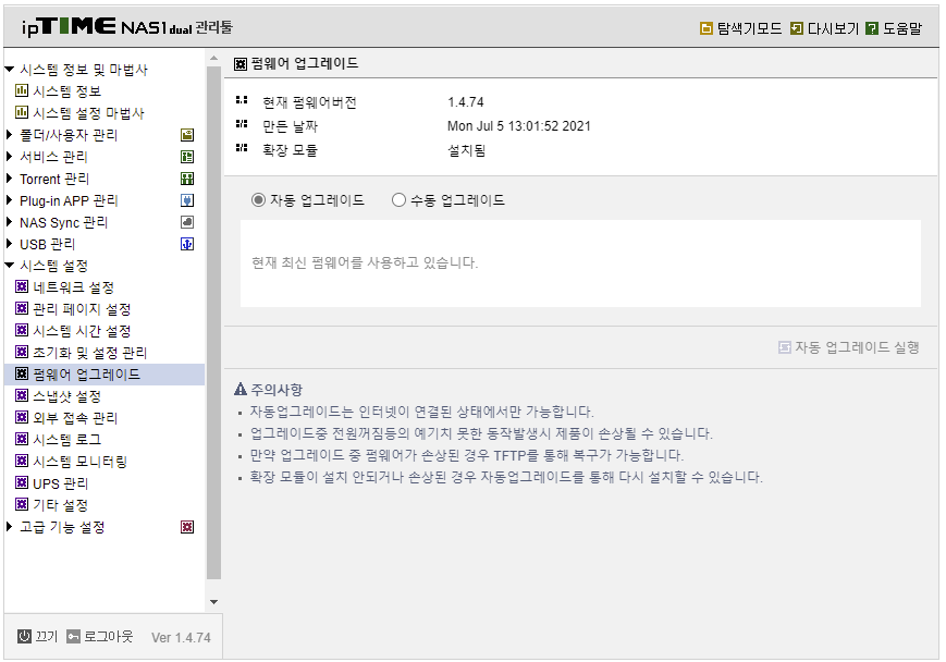 EFM, NAS dual 시리즈 1.4.74 펌웨어 업데이트