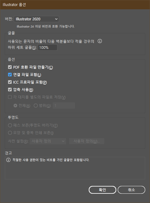 편집 반영이 바로바로 되게 포함해두고 쓰다가, 인쇄소 등에 보내주려면 이미지를 포함해야 하고, 글꼴도 깨줘야 올바르게 표시가 된다. 생각보다 인쇄소에 없는 글꼴 꽤 되니까(스포카나 프리텐다드 등) 글꼴은 그냥 전체 선택 후 확장 > 오브젝트 해주면 되고, 대지 밖 등도 정리하고 해서 넘겨주면 되는데 저장할 때 포함하는 옵션(연결 파일 포함(L))이 있으니 이를 사용하도록 합시다.