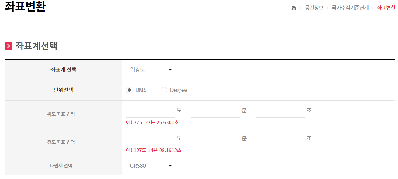도분초 <> 위경도 변환 사이트 2021.08.24 00:22 Web.World/Trivia 반응형 구글링만해봐도 쉽게 나오긴 하고, 여러 외국 사이트에서 제공하고 있고, GIS류 소프트웨어를 사용해 변환할 수도, 비교적 간단한 수식이기에 엑셀 등을 활용해 좀 더 쉽게 변환할 수 있지만 국토정보플랫폼에서 이러한 기능을 제공하고 있으니 참조하도록 합시다. 반응형 공유하기 게시글 관리 Klein Berry 'Web.World > Trivia' 카테고리의 다른 글 PC 카카오톡 사진 묶어 보내기 설정하기 (0) 2021.09.13 티스토리)상단 스크롤바(진행바) 넣기 (0) 2021.08.19 알리) 반지름(R) 게이지 (0) 2021.06.28 댓글 공유하기 다른 글 댓글 이 글 공유하기 구독하기 구독하기 카카오톡 카카오톡 라인 라인 트위터 트위터 Facebook Facebook 카카오스토리 카카오스토리 밴드 밴드 네이버 블로그 네이버 블로그 Pocket Pocket Evernote Evernote 다른 글 NextCloud Pi, WebDAV 사용하기 NextCloud Pi, WebDAV 사용하기 2021.09.13 PC 카카오톡 사진 묶어 보내기 설정하기 PC 카카오톡 사진 묶어 보내기 설정하기 2021.09.13 티스토리)상단 스크롤바(진행바) 넣기 티스토리)상단 스크롤바(진행바) 넣기 2021.08.19 알리) 반지름(R) 게이지 알리) 반지름(R) 게이지 2021.06.28 다른 글 더 둘러보기