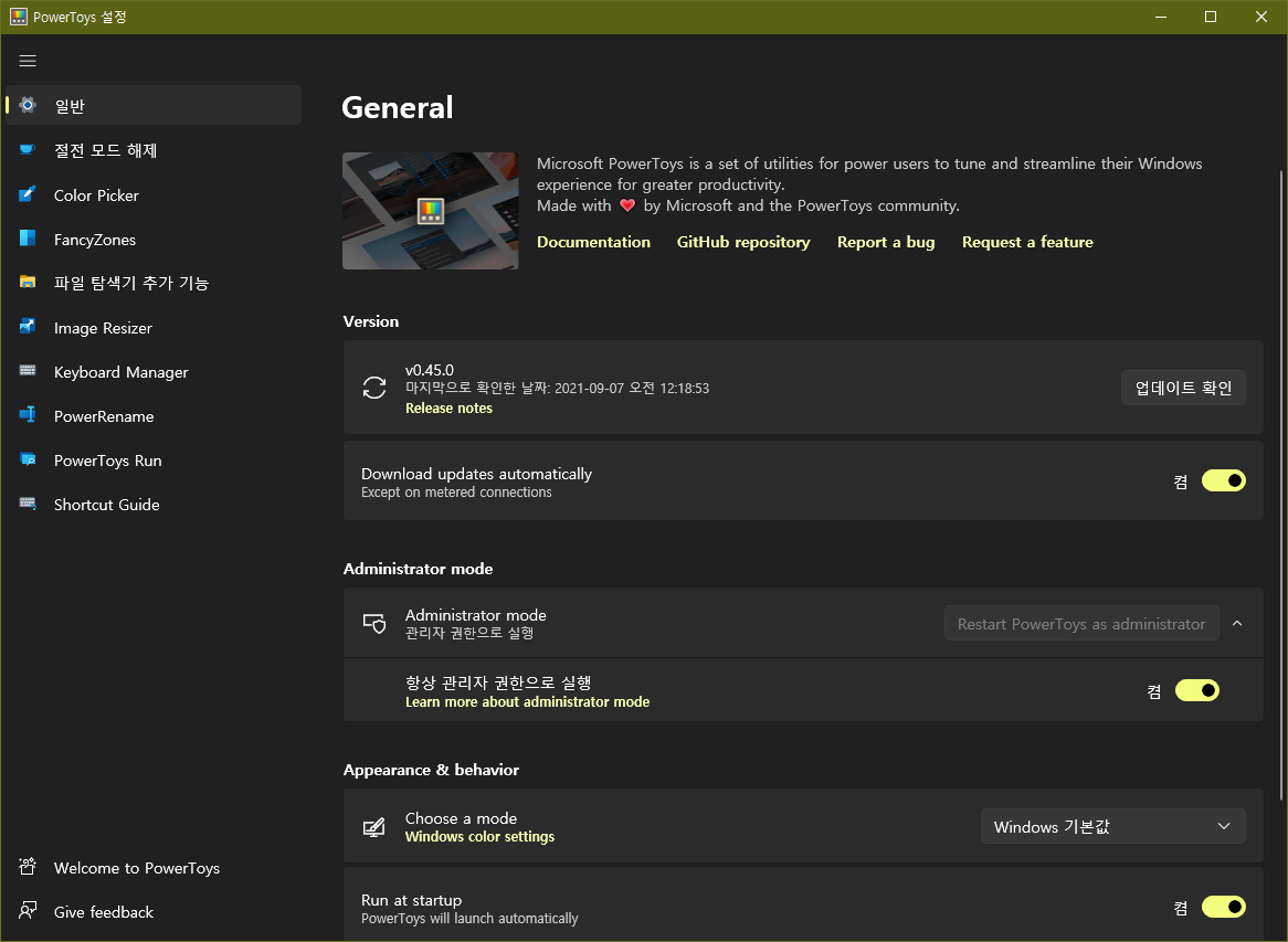 윈도 10용 PowerToys 최신 버전(v0.45.0) 출시 2021.09.07 00:19 PC.Div.Soft/Free Software 반응형 윈도10용 PowerToys의 v0.45.0 버전이 공개되었습니다. 이번 업데이트에서 윈도11부터 적용되는 Fluent 디자인이 적용되어 좀 더 모던한 UI로 개편되었습니다. 반응형 공유하기 게시글 관리 Klein Berry 'PC.Div.Soft > Free Software' 카테고리의 다른 글 Rufus 3.16 업데이트, 윈도 11 제한 우회 옵션 추가 등 (0) 2021.10.16 AMD FSR 기반의 이미지 업스케일링 프로그램 FidelityFX-CLI (0) 2021.08.23 86Box 다운로드하기 (0) 2021.08.19 댓글 공유하기 다른 글 댓글 이 글 공유하기 구독하기 구독하기 카카오톡 카카오톡 라인 라인 트위터 트위터 Facebook Facebook 카카오스토리 카카오스토리 밴드 밴드 네이버 블로그 네이버 블로그 Pocket Pocket Evernote Evernote 다른 글 좌표 변환 툴 eye4software - coordinate calculator 좌표 변환 툴 eye4software - coordinate calculator 2021.10.22 Rufus 3.16 업데이트, 윈도 11 제한 우회 옵션 추가 등 Rufus 3.16 업데이트, 윈도 11 제한 우회 옵션 추가 등 2021.10.16 AMD FSR 기반의 이미지 업스케일링 프로그램 FidelityFX-CLI AMD FSR 기반의 이미지 업스케일링 프로그램 FidelityFX-CLI 2021.08.23 86Box 다운로드하기 86Box 다운로드하기 2021.08.19 다른 글 더 둘러보기