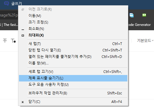 그리고 세로 탭 상태에서 제목 표시줄을 마우스 우클리하면 제목 표시줄 숨기기(L)가 활성화되는데, 이를 클릭해 브라우저의 제목 표시줄까지 안보이게 해서 좀 더 화면을 넓게 쓸 수 있으니 참조합시다.