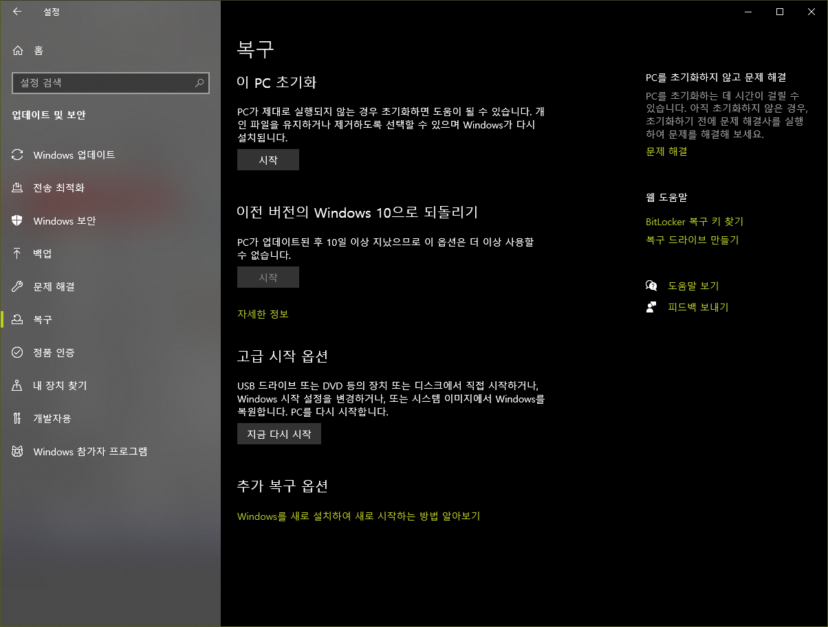 빠른 시작(Fast Boot)등을 켜두면 가끔 EFI 들어갈 때 애로사항이 꽃피는데, 대부분 머더보드 제조사에서 제공하는 Restart to UEFI...같은 거 써도 되는데, 윈도에서 자체적으로 제공하고 있다. 설정 > 업데이트 및 보안 > 복구에서 고급 시작 옵션을 눌러봅시다.