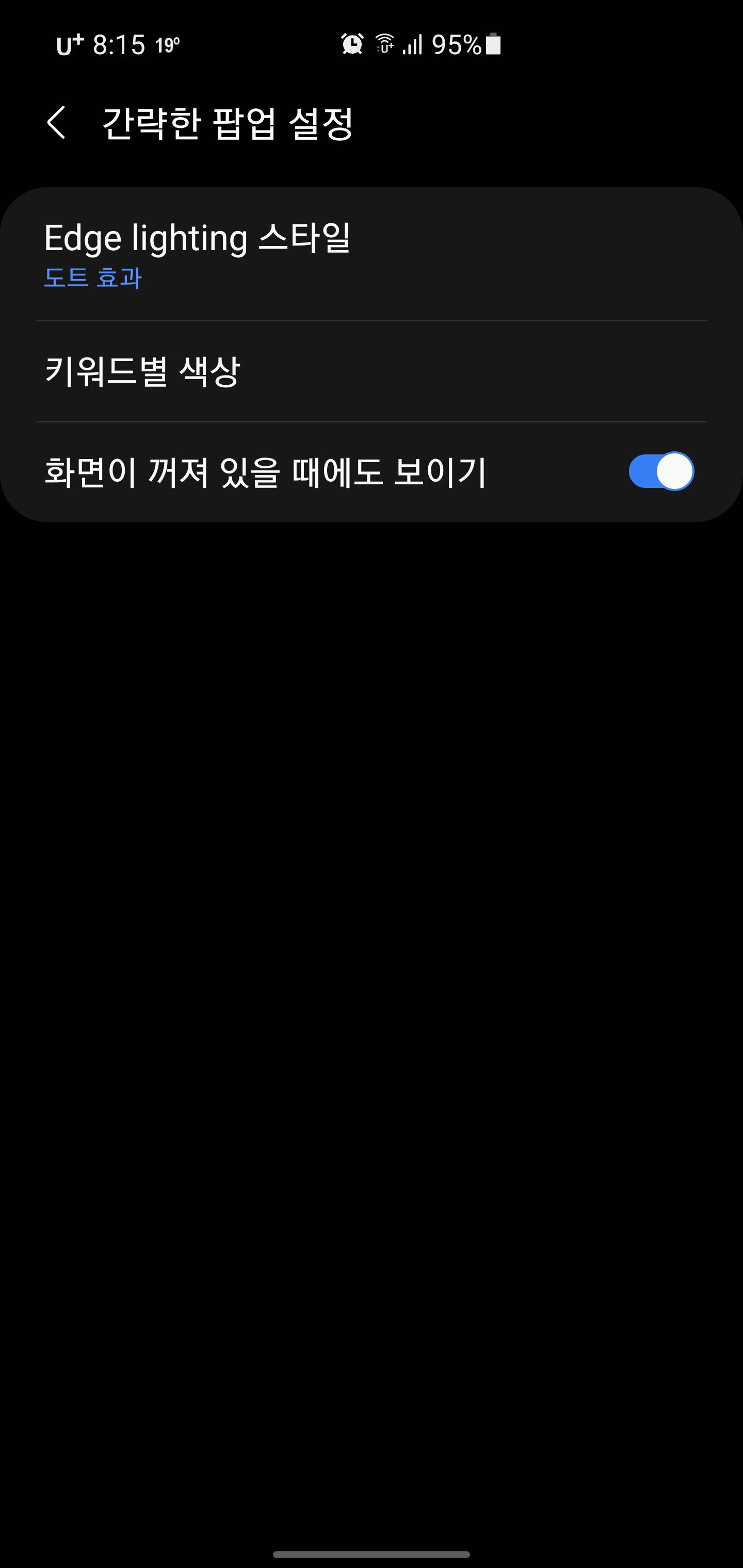 갤럭시 S 시리즈 엣지 라이팅 설정하기 2021.09.28 16:16 ETC.Mobile/Phone.Console 반응형 엣지 라이팅 이쁘긴 한데, 게임하거나 할 때는 가끔 거슬리긴 하더라. 근데 이게 이뻐서 자꾸 쓰게 됨. 아무튼 이 기능은 안드로이드 11올라오고 나서는 설정 > 알림 > 간략한 팝업 설정 > Edge lighting 스타일에서 설정할 수 있으니 참조합시다. 반응형 공유하기 게시글 관리 Klein Berry 'ETC.Mobile > Phone.Console' 카테고리의 다른 글 LG, 2022년 2분기 소프트웨어 업데이트 계획(3월 기준) (0) 2022.04.14 LG Q92, 안드로이드 11 OS 업그레이드 (0) 2021.06.29 LG Q9 ONE, 안드로이드 11 업데이트 (0) 2021.03.05 댓글 공유하기 다른 글 댓글 이 글 공유하기 구독하기 구독하기 카카오톡 카카오톡 라인 라인 트위터 트위터 Facebook Facebook 카카오스토리 카카오스토리 밴드 밴드 네이버 블로그 네이버 블로그 Pocket Pocket Evernote Evernote 다른 글 Apple iOS 15.6 업데이트 Apple iOS 15.6 업데이트 2022.07.22 LG, 2022년 2분기 소프트웨어 업데이트 계획(3월 기준) LG, 2022년 2분기 소프트웨어 업데이트 계획(3월 기준) 2022.04.14 LG Q92, 안드로이드 11 OS 업그레이드 LG Q92, 안드로이드 11 OS 업그레이드 2021.06.29 LG Q9 ONE, 안드로이드 11 업데이트 LG Q9 ONE, 안드로이드 11 업데이트 2021.03.05 다른 글 더 둘러보기