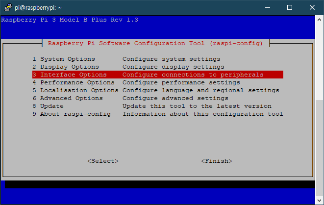 설정 화면에서 Intefacing Options 들어가서, SSH 활성화, 저장 후 재시작(sudo reboot, Putty 재접속)