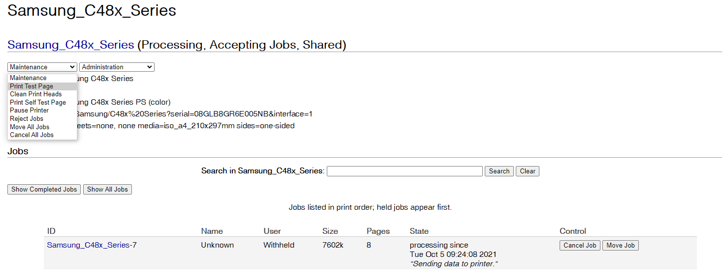 메인터넌스 드롭다운 메뉴 눌러서 테스트 페이지해보고, 인쇄된 페이지에 Printer test page라는 글과 데비안 로고가 나오면 성공. 이제 제어판 등에서 공유프린터@raspberrypi 나 위에서 설정한 프린터 추가해주면 된다.