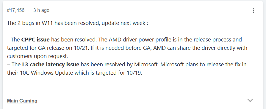 AMD Ryzen용 윈도 11 패치, 다음주 쯤 공개 2021.10.14 04:29 PC.Div.Soft/Windows.Office 반응형 Reddit의 글에 따르면 AMD Ryzen과 윈도 11의 문제와 과련해 CPPC(코어 할당 문제)의 경우 10/21일에, L3 캐시 지연 문제는 10/19일 윈도 업데이트를 통해 배포될 예정이라고 합니다. 반응형 공유하기 게시글 관리 Klein Berry 'PC.Div.Soft > Windows.Office' 카테고리의 다른 글 윈도 10/11 넷플릭스 앱에서 소리가 안날 때 (0) 2021.10.21 윈도11, Intel Killer 소프트웨와의 호환 문제 해결 업데이트 (0) 2021.10.14 윈도11, 레지스트리에 ASCII문자가 아닌경우 작동 멈춰 (0) 2021.10.13 댓글 공유하기 다른 글 댓글 이 글 공유하기 구독하기 구독하기 카카오톡 카카오톡 라인 라인 트위터 트위터 Facebook Facebook 카카오스토리 카카오스토리 밴드 밴드 네이버 블로그 네이버 블로그 Pocket Pocket Evernote Evernote 다른 글 AMD, Win11 성능 저하 수정 패치 배포 AMD, Win11 성능 저하 수정 패치 배포 2021.10.22 윈도 10/11 넷플릭스 앱에서 소리가 안날 때 윈도 10/11 넷플릭스 앱에서 소리가 안날 때 2021.10.21 윈도11, Intel Killer 소프트웨와의 호환 문제 해결 업데이트 윈도11, Intel Killer 소프트웨와의 호환 문제 해결 업데이트 2021.10.14 윈도11, 레지스트리에 ASCII문자가 아닌경우 작동 멈춰 윈도11, 레지스트리에 ASCII문자가 아닌경우 작동 멈춰 2021.10.13 다른 글 더 둘러보기
