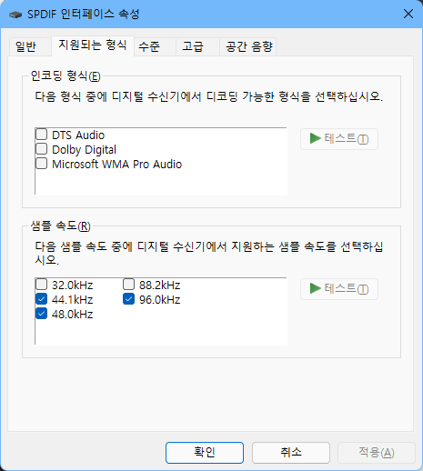 윈도11 기준 설정 > 시스템 > 소리 > 더 많은 소리 설정 > 소리 설정에서 자기의 현재 출력 장치 선택 > 속성의 [지원되는 형식]탭에서 인코딩 형식(E)을 하나씩 테스트해서 소리나지 않는 건 다 빼주면 된다. 테스트 안하고 그냥 체크해제해도 무방. 아마 소리 안나는 경우라면 Dolby Digital, DTS Audio등이 설정되어 있는 경우지 않나 싶음. 그래도 안 들린다면 다른 [고급]탭에서 단독 모드를 모두 체크 해제해서 단독 모드를 풀어줘 봅시다.