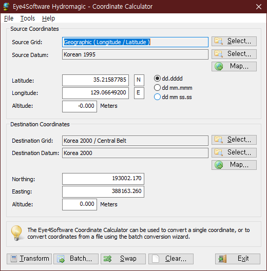 EYE4SOFTWARE에서 제공하는 좌표 계산기를 사용해도 비교적 손쉽게 원하는 정보를 얻을 수 있지 않나 싶음. csv파일 변환도 지원하고 있으니 참조합시다. Map 버튼 누르면 구글 지도로 위치 알려주니 참조하고, 다만 위경도 > TM은 괜찮은데 TM > 위경도로 바꾸니까 값이 달라지는 것 같다. 조금 차이가 나는 거 같은데 이유를 잘 모르겠음;ㅅ;