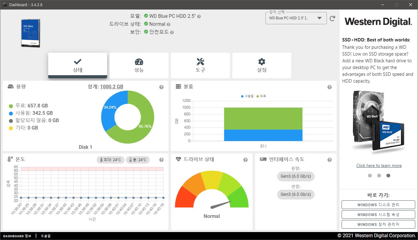 WD 대시보드 2021.10.29 10:50 PC.Div.Soft 반응형 샌디스크/웬디 하드디스크, SSD의 상태를 확인할 수 있는 프로그램. 다운로드는 공식 홈페이지에서 가능하다. SSD쓰면 보통 크리스털 디스크 인포나 HWinfo64...정도만 설치해두는데, 그래도 자사 툴이 좀 더 정확하지 않을까 싶어서 설치해봄. 구형 HDD같은 거 체크해보기용이라 될려나 걱정했는데 별 문제 없이 잘 인식하더라. 근데 번역이 좀 미묘하다...무료...라니; 여유 공간이 올바른 말이 아닐까 싶음. 반응형 공유하기 게시글 관리 Klein Berry 'PC.Div.Soft' 카테고리의 다른 글 Acer Nitro Sence 업데이트(3.01.3024) (0) 2021.11.13 Lenovo의 Windows 11 관련(윈7에서 업데이트 시 클린 설치 필요) (0) 2021.07.08 으어 무뽑... (0) 2021.07.06 댓글 공유하기 다른 글 댓글 이 글 공유하기 구독하기 구독하기 카카오톡 카카오톡 라인 라인 트위터 트위터 Facebook Facebook 카카오스토리 카카오스토리 밴드 밴드 네이버 블로그 네이버 블로그 Pocket Pocket Evernote Evernote 다른 글 TPM 2.0 관련 서적 TPM 2.0 관련 서적 2022.01.07 Acer Nitro Sence 업데이트(3.01.3024) Acer Nitro Sence 업데이트(3.01.3024) 2021.11.13 Lenovo의 Windows 11 관련(윈7에서 업데이트 시 클린 설치 필요) Lenovo의 Windows 11 관련(윈7에서 업데이트 시 클린 설치 필요) 2021.07.08 으어 무뽑... 으어 무뽑... 2021.07.06 다른 글 더 둘러보기