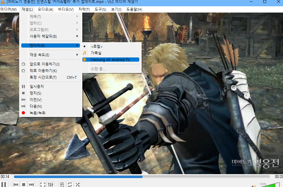 그 다음은 PC, 공유기, TV를 한 번 재시작해주면 장치가 정상적으로 등록되고 나머진 윈도에 포함된 영화 및 TV앱을 사용해 장치로 캐스트 기능을 사용하면 된다. 꼭 미디어 플레이어나 기본 앱 아니라 그냥 이를 지원하는 앱들을 사용하면 되는데, 개인적으론 VLC 추천. 무료고, 여러가지 재생도 잘 되고. 일단 VLC에서 영상을 열고, 재생 > 렌더러에서 보려는 장치를 선택하고 잠깐 기다리면 재생되니 참조합시다.