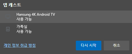 브라우저(엣지/크롬)에서도 가능하다. 엣지는 햄버거/더보기 메뉴 > 기타 도구 > 장치로 캐스트에서 사용 가능. 혹 장치가 안 뜬다면 설정 > Bluetooth 및 장치 > 장치 추가 > 무선 디스플레이 또는 도크를 선택해서 검색 해보도록 합시다. 근데 대게 장치들은 같은 네트워크 안에만 있고, 개인 네트워크와 공유 및 검색만 켜두면 다들 알아서 추가되니 클 불편함 없이 사용할 수 있지 않나 싶음.