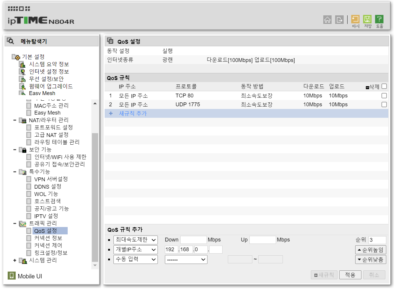 참 공유기 모델에 따라 다르겠지만 ipTIME공유기의 경우 보통은 고급 설정 > 트래픽 관리 > QoS 설정에 있다.