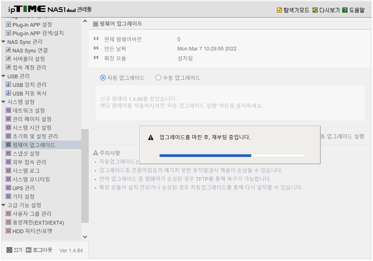 EFM의 ipTIME NAS dual시리즈의 신규 펌웨어(v1.4.86)가 등록되었습니다. 정식 버전이며 자동 업그레이드를 지원합니다. 이번 버전 변경사항에 눈여겨 볼 사항이 있는데, FTPS 옵션 추가, Apache서버에서 PHP 5.4 삭제, 그에 따른 관련 웹앱 및 플러그인 삭제(PHP 5.4를 유지해야 한다면 펌업 금지), HDD 포맷 옵션에서 NTFS삭제가 이루어졌습니다.