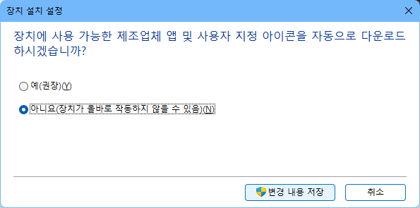 윈도11, 드라이버 자동 업데이트 방지하기 2022.04.21 00:10 PC.Div.Soft/Tip 반응형 AMD 그래픽 드라이버가 업데이트에 등록된 버전으로 자주 롤백되길래 짜증나서 설정. 설정은 간단하다. 시스템 속성 > 하드웨어 > 장치 설치 설정에서 아니요로 설정하면된다. 시스템 속성 들어가는 방법은 여러가지가 있겠지만 그냥 시작 누르고 고급 시스템 입력하면 고급 시스템 설정 보기 메뉴가 나오니 참조하시길. 반응형 공유하기 게시글 관리 Klein Berry 'PC.Div.Soft > Tip' 카테고리의 다른 글 AMD Software 설치 시 mscoree.dll 오류 뜰 적에 (0) 2022.05.14 AMD Radeon RX 6600/6600XT 절전모드 깨어나지 못하는 이슈 (0) 2022.04.20 shx 파일 모음 (0) 2022.03.16 댓글 공유하기 다른 글 댓글 이 글 공유하기 구독하기 구독하기 카카오톡 카카오톡 라인 라인 트위터 트위터 Facebook Facebook 카카오스토리 카카오스토리 밴드 밴드 네이버 블로그 네이버 블로그 Pocket Pocket Evernote Evernote 다른 글 인텔 12세대 휨 방지 가이드 인텔 12세대 휨 방지 가이드 2022.05.18 AMD Software 설치 시 mscoree.dll 오류 뜰 적에 AMD Software 설치 시 mscoree.dll 오류 뜰 적에 2022.05.14 AMD Radeon RX 6600/6600XT 절전모드 깨어나지 못하는 이슈 AMD Radeon RX 6600/6600XT 절전모드 깨어나지 못하는 이슈 2022.04.20 shx 파일 모음 shx 파일 모음 2022.03.16 다른 글 더 둘러보기