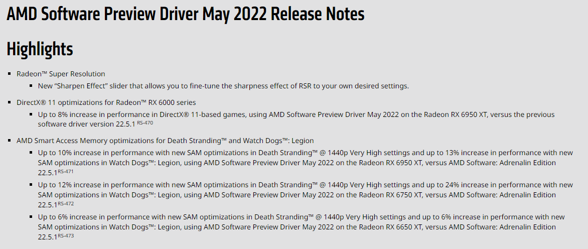 말 그대로인 버전. AMD Software Preview Driver May 2022. AMD 홈페이지에서 받을 수 있다. 릴리즈노트에도 나와 있고, 이미 여러 웹에서 이런저런 자료 공개한 만큼 Radeon RX 6000시리즈에서 DX11 게임류의 최대 성능 향상이 있다고 함. 8% 정도라고 하며, 아드레날린과 같은 기타 메이저 업데이트가 있을 때마다 4% 가량의 성능 향상이 있었던 적이 있기에 어찌보면 딱히 놀라울 건 없지 않나 싶다.