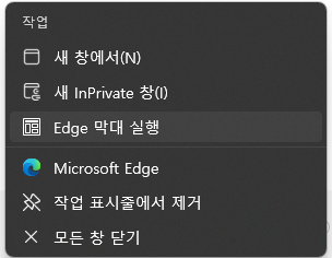 사용법은 간단하다. 엣지 실행 > 작업 표시줄에서 엣지 아이콘 마우스 우 클릭 > Edge 막대 실행 누르면 됨.
