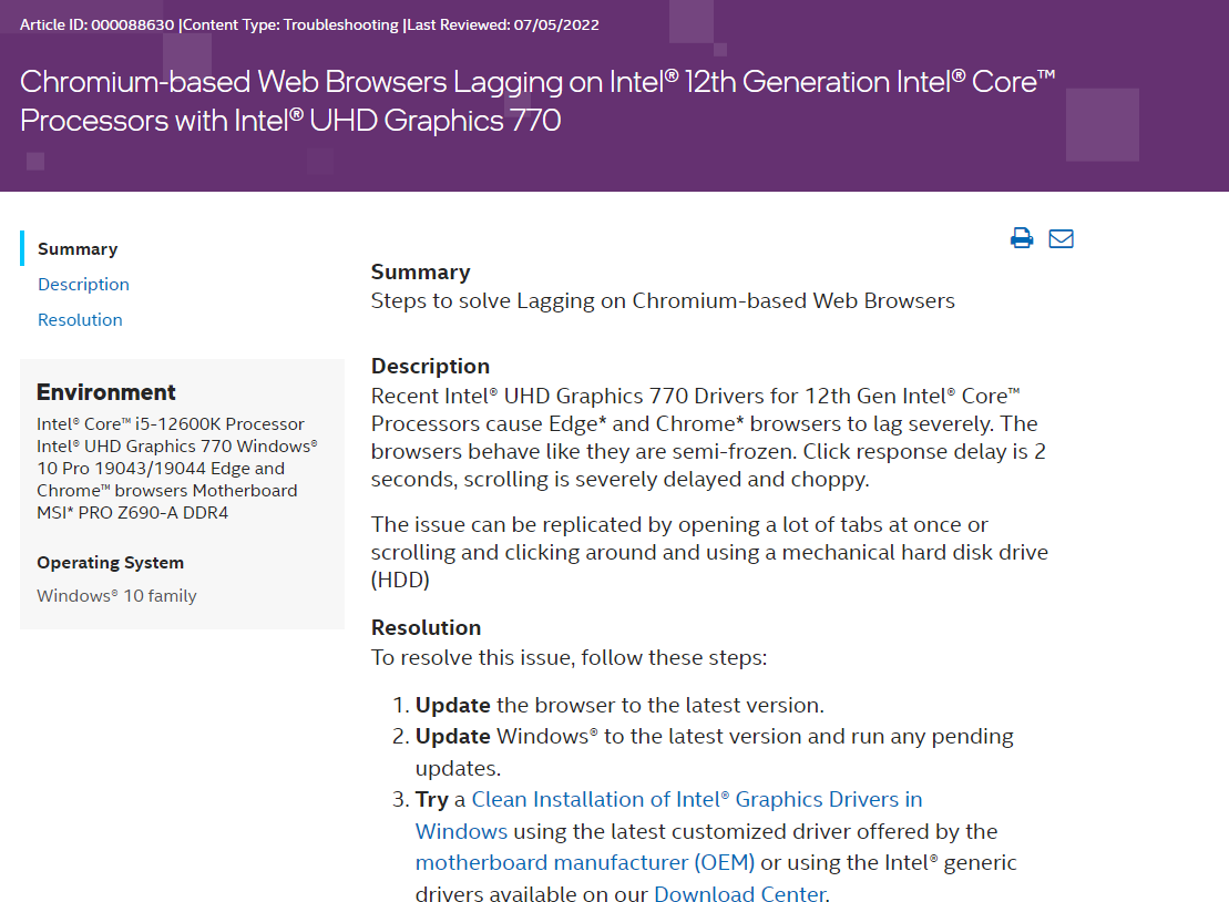 Intel UHD 770(12세대) 프로세서의 크롬 브라우저 관련 문제 2022.07.09 22:18 PC.Div.Soft/Tip 반응형 Intel이 자사의 12세대 Core 프로세서용으로 제공되는 UHD770 그래픽 드라이버에 크로뮴 기반의 크롬, 엣지(Edge)브라우저에서 클릭 지연(2초 정도)이 발생한다고 합니다. 한 번의 많은 탭을 열거나 스크롤하면 문제 발생이 더 자주 일어나며, HDD를 사용한다면 더 자주 겪는다고 합니다. 해결 방법은 SSD 사용, 브라우저 및 그래픽 드라이버 업데이트, 윈도 업데이트 등을 해볼것을 권하고 있습니다. 아니면 브라우저의 하드웨어 가속도 비활성화할 것을 권한다고 하네요. UHD 770 사용하시면서 이상하게 인터넷하면서 문제가 있는 분들이라면 업데이트를 자주자주 챙겨보시는 걸 권장합니다. 반응형 공유하기 게시글 관리 Klein Berry 'PC.Div.Soft > Tip' 카테고리의 다른 글 윈도10, 11 공유폴더 해제하기 (0) 2022.07.14 타무즈(TAMMUZ) GK시리즈 SSD 툴박스 (0) 2022.07.07 OSGeo4W 제거하기 (0) 2022.07.05 댓글 공유하기 다른 글 댓글 이 글 공유하기 구독하기 구독하기 카카오톡 카카오톡 라인 라인 트위터 트위터 Facebook Facebook 카카오스토리 카카오스토리 밴드 밴드 네이버 블로그 네이버 블로그 Pocket Pocket Evernote Evernote 다른 글 Radeon Image Sharpening 사용하기 Radeon Image Sharpening 사용하기 2022.07.18 윈도10, 11 공유폴더 해제하기 윈도10, 11 공유폴더 해제하기 2022.07.14 타무즈(TAMMUZ) GK시리즈 SSD 툴박스 타무즈(TAMMUZ) GK시리즈 SSD 툴박스 2022.07.07 OSGeo4W 제거하기 OSGeo4W 제거하기 2022.07.05 다른 글 더 둘러보기
