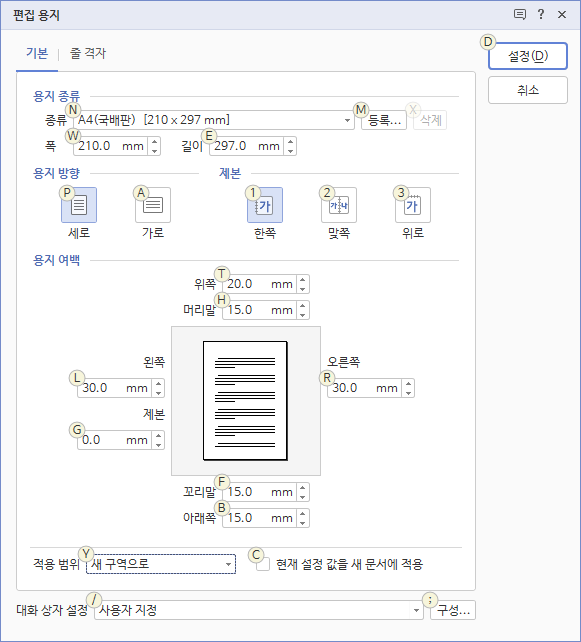한컴오피스(한글)에서 용지 방향 가로/세로 따로 적용하기 2022.07.25 02:53 PC.Div.Soft/Tip 반응형 생각보다 간단한데, 가끔 까먹게 됨. 편집 용지(파일 - 편집 용지(F7)) 에서 용지 방향을 설정할 때에, 아래 부분에 있는 적용 범위를 문서 전체가 아니라 [새 구역으로 - Alt+Y] 해두면 세로/가로 용지 방향을 따로 따로 설정할 수 있으니 참조합시다. 반응형 공유하기 게시글 관리 Klein Berry 'PC.Div.Soft > Tip' 카테고리의 다른 글 MS PowerPoint 스토리보딩 확장 (0) 2022.07.25 한컴 스페이스(개인 2GB, 웹한글 개인 사용자 무료) (0) 2022.07.25 NVIDIA 비디오 인코딩/디코딩 테이블 (0) 2022.07.24 댓글 공유하기 다른 글 댓글 이 글 공유하기 구독하기 구독하기 카카오톡 카카오톡 라인 라인 트위터 트위터 Facebook Facebook 카카오스토리 카카오스토리 밴드 밴드 네이버 블로그 네이버 블로그 Pocket Pocket Evernote Evernote 다른 글 스마트폰 음악을 PC스피커로 재생하기(블투 사용) 스마트폰 음악을 PC스피커로 재생하기(블투 사용) 2022.07.27 MS PowerPoint 스토리보딩 확장 MS PowerPoint 스토리보딩 확장 2022.07.25 한컴 스페이스(개인 2GB, 웹한글 개인 사용자 무료) 한컴 스페이스(개인 2GB, 웹한글 개인 사용자 무료) 2022.07.25 NVIDIA 비디오 인코딩/디코딩 테이블 NVIDIA 비디오 인코딩/디코딩 테이블 2022.07.24 다른 글 더 둘러보기