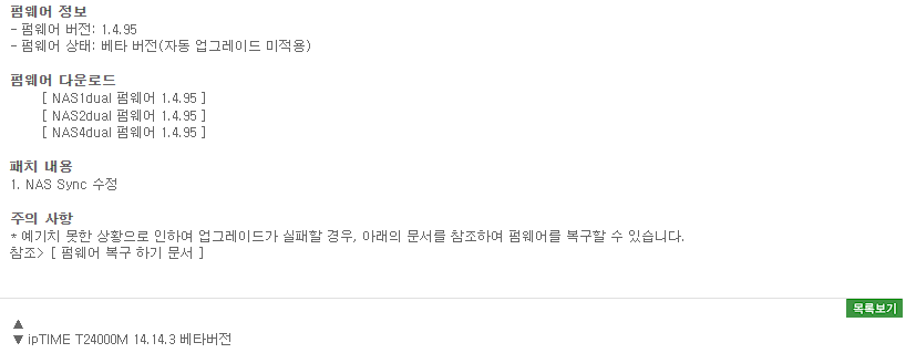 EFM,ipTIME NAS dual 시리즈 Beta BIOS(1.4.95) 2022.08.18 02:02 ETC.Mobile/Nas.HomeLab 반응형 EFM의 ipTIME NAS dual 시리즈(NAS1dual/2dual/4dual) 제품의 베타 펌웨어 1.4.95버전이 등록되었습니다. 수동 업데이트로 업데이트 가능하며, 업데이트 내역은 NAS Sync 수정이라고 하니 사용하시는 분들은 참조하세요. 반응형 공유하기 게시글 관리 Klein Berry 'ETC.Mobile > Nas.HomeLab' 카테고리의 다른 글 ipTIME NAS dual 시리즈 펌웨어 1.4.98 출시 (0) 2022.08.25 Synology dsm 7.1.1 42951 출시(RC버전) (0) 2022.08.11 EFM, ipTIME NAS dual시리즈 펌웨어 업데이트(v1.4.86) (0) 2022.03.11 댓글 공유하기 다른 글 댓글 이 글 공유하기 구독하기 구독하기 카카오톡 카카오톡 라인 라인 트위터 트위터 Facebook Facebook 카카오스토리 카카오스토리 밴드 밴드 네이버 블로그 네이버 블로그 Pocket Pocket Evernote Evernote 다른 글 Synology, Active Insight 활성화하기 Synology, Active Insight 활성화하기 2022.08.28 ipTIME NAS dual 시리즈 펌웨어 1.4.98 출시 ipTIME NAS dual 시리즈 펌웨어 1.4.98 출시 2022.08.25 Synology dsm 7.1.1 42951 출시(RC버전) Synology dsm 7.1.1 42951 출시(RC버전) 2022.08.11 EFM, ipTIME NAS dual시리즈 펌웨어 업데이트(v1.4.86) EFM, ipTIME NAS dual시리즈 펌웨어 업데이트(v1.4.86) 2022.03.11 다른 글 더 둘러보기