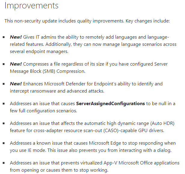 윈도 11 업데이트(KB5016691) 미리보기 배포 2022.08.26 17:08 PC.Div.Soft/Windows.Office 반응형 윈도 11 업데이트 미리보기(KB5016691)가 배포되었습니다. USB 프린터 오작동 및 블투 헤드셋 관련한 문제가 해결된 버전이라고 합니다. 그 외에도 CASO 지원 GPU 드라이버의 HDR 문제, BitLocker 성능 저하 문제 등도 수정되었다고하니 참조하세요. 반응형 공유하기 게시글 관리 Klein Berry 'PC.Div.Soft > Windows.Office' 카테고리의 다른 글 윈도11) 코어 격리 메모리 무결성 설정 끄기 (2) 2022.09.11 MS, 윈도10의 다시 시작 등에서 에러가 일어나는 문제를 수정 (0) 2022.08.25 Windows 11, 보안 업데이트를 설치하지 못하는 문제 (0) 2022.08.16 댓글 공유하기 다른 글 댓글 이 글 공유하기 구독하기 구독하기 카카오톡 카카오톡 라인 라인 트위터 트위터 Facebook Facebook 카카오스토리 카카오스토리 밴드 밴드 네이버 블로그 네이버 블로그 Pocket Pocket Evernote Evernote 다른 글 윈도 11, 9월 업데이트 배포중 윈도 11, 9월 업데이트 배포중 2022.09.14 윈도11) 코어 격리 메모리 무결성 설정 끄기 윈도11) 코어 격리 메모리 무결성 설정 끄기 2022.09.11 MS, 윈도10의 다시 시작 등에서 에러가 일어나는 문제를 수정 MS, 윈도10의 다시 시작 등에서 에러가 일어나는 문제를 수정 2022.08.25 Windows 11, 보안 업데이트를 설치하지 못하는 문제 Windows 11, 보안 업데이트를 설치하지 못하는 문제 2022.08.16 다른 글 더 둘러보기