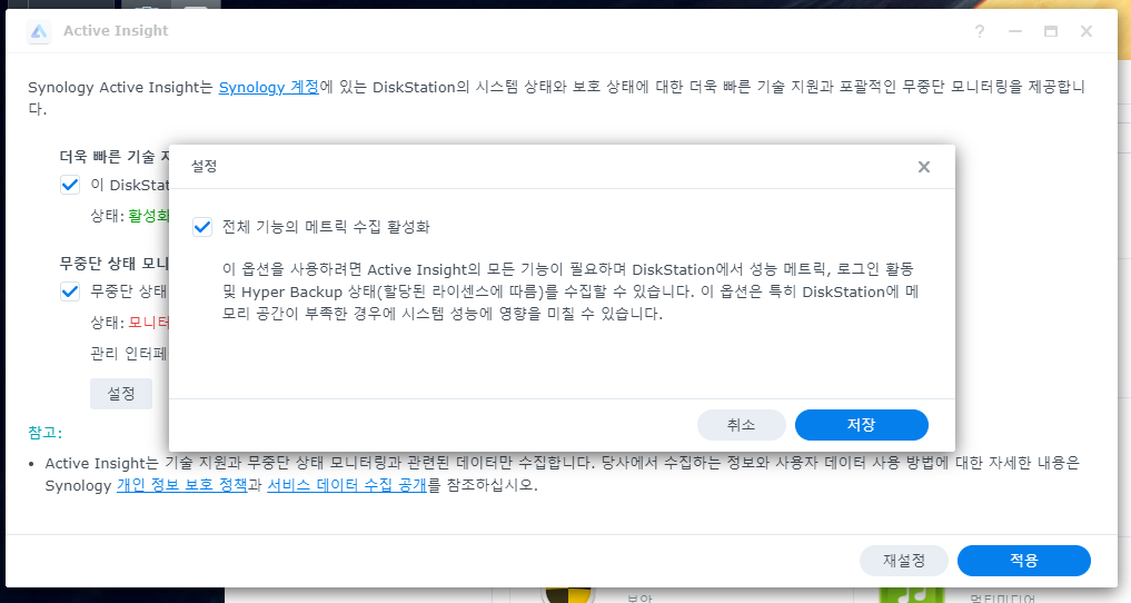 설정하는 건 큰 어려움 없고, 대시보드에서 이것저것 누르면 알려주는데, 일단 ActiveInsight 대시보드 페이지와 등록할 NAS(DSM 7.1.1버전)에서 로그인 한 후, 오랜만에 관리자 페이지에 접속한다면 일단 패키지 센터에서 앱을 업데이트해주자. 그 후 Active Insight 앱을 실행하고, 무중단 상태 부분의 설정을 눌러서 전체 기능의 메트릭 수집 활성화를 해주면 된다.