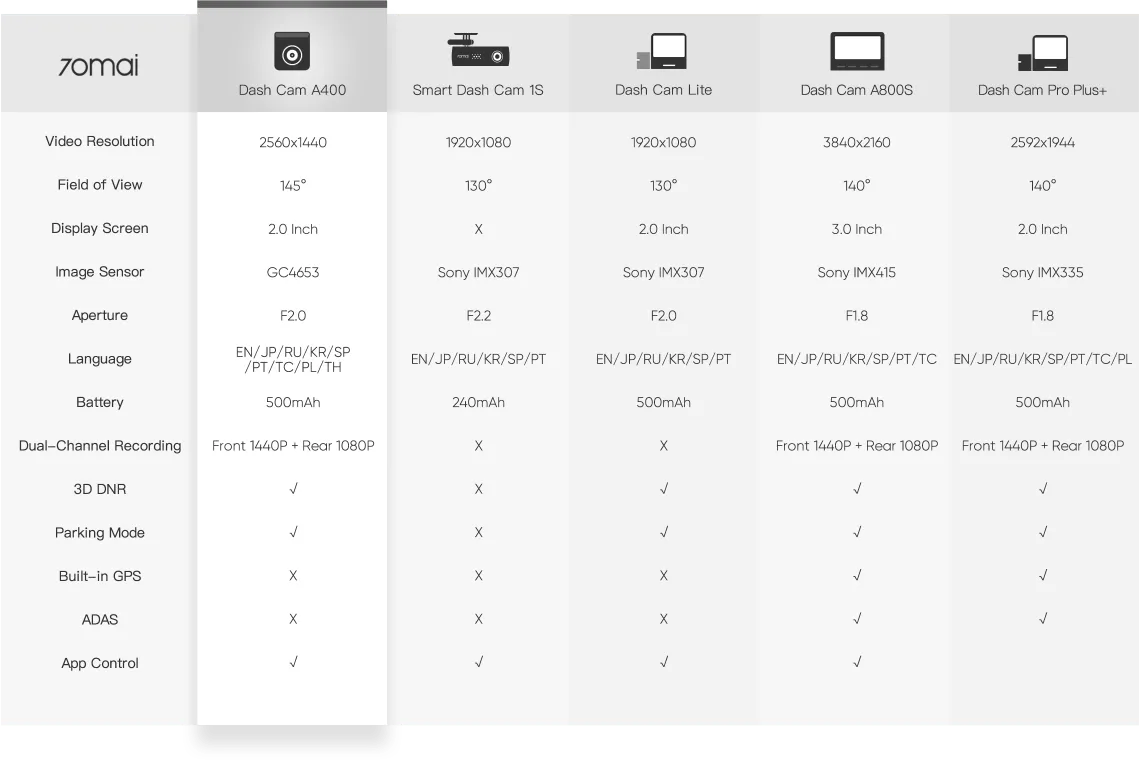 제품 모델별 사양은 70MAI 홈페이지에서 확인 가능하다. A400의 특징은 뛰어난 야간 화질이라는 듯....하다.