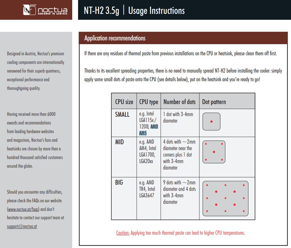 AM4의 경우 중앙 + 모서리였는데, 이번 AM5 소켓에서는 중앙에만 찍으라고 합니다. 근데 이건 히트 스프레더의 모양이 미묘해서 그런 걸수도 있지만요. 아무튼 AMD의 권장사항도 아니고, 써멀 도포법이 새롭게 소개되는 건 아니지만 이러한 게 있다는 거 정도만 체크해두시면 되겠네요.