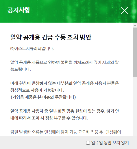 이스트시큐리티, 알약 공개용 조치 방안 공개 2022.08.31 00:18 ETC.Mobile/News.Security 반응형 오진(....)으로 인한 먹통 현상 등이 발생한 알약과 관련해서 이스트 시큐리티에서 공지사항이 올라왔습니다. 수동 조치툴 다운로드 한 뒤 실행하라고 하며, 다운로드가 불가능한 상황이라면 윈도를 안전모드(네트워킹 사용)로 부팅하여 다운로드를 진행하라고 합니다. 반응형 공유하기 게시글 관리 Klein Berry 'ETC.Mobile > News.Security' 카테고리의 다른 글 Google, Pixel 7/Pixel Watch 10월 6일 출시 예정 (0) 2022.09.08 Apple, iOS/iPadOS 15.5 공개(보안 업데이트) (0) 2022.05.19 LG, V50s, Q92, LG Velvet LTE 등 안드로이드 12 업데이트 (0) 2022.05.10 댓글 공유하기 다른 글 댓글 이 글 공유하기 구독하기 구독하기 카카오톡 카카오톡 라인 라인 트위터 트위터 Facebook Facebook 카카오스토리 카카오스토리 밴드 밴드 네이버 블로그 네이버 블로그 Pocket Pocket Evernote Evernote 다른 글 퀄컴, 미드레인지 및 엔트리용 프로세서 신제품 출시, 새로운 이름으로 퀄컴, 미드레인지 및 엔트리용 프로세서 신제품 출시, 새로운 이름으로 2022.09.08 Google, Pixel 7/Pixel Watch 10월 6일 출시 예정 Google, Pixel 7/Pixel Watch 10월 6일 출시 예정 2022.09.08 Apple, iOS/iPadOS 15.5 공개(보안 업데이트) Apple, iOS/iPadOS 15.5 공개(보안 업데이트) 2022.05.19 LG, V50s, Q92, LG Velvet LTE 등 안드로이드 12 업데이트 LG, V50s, Q92, LG Velvet LTE 등 안드로이드 12 업데이트 2022.05.10 다른 글 더 둘러보기
