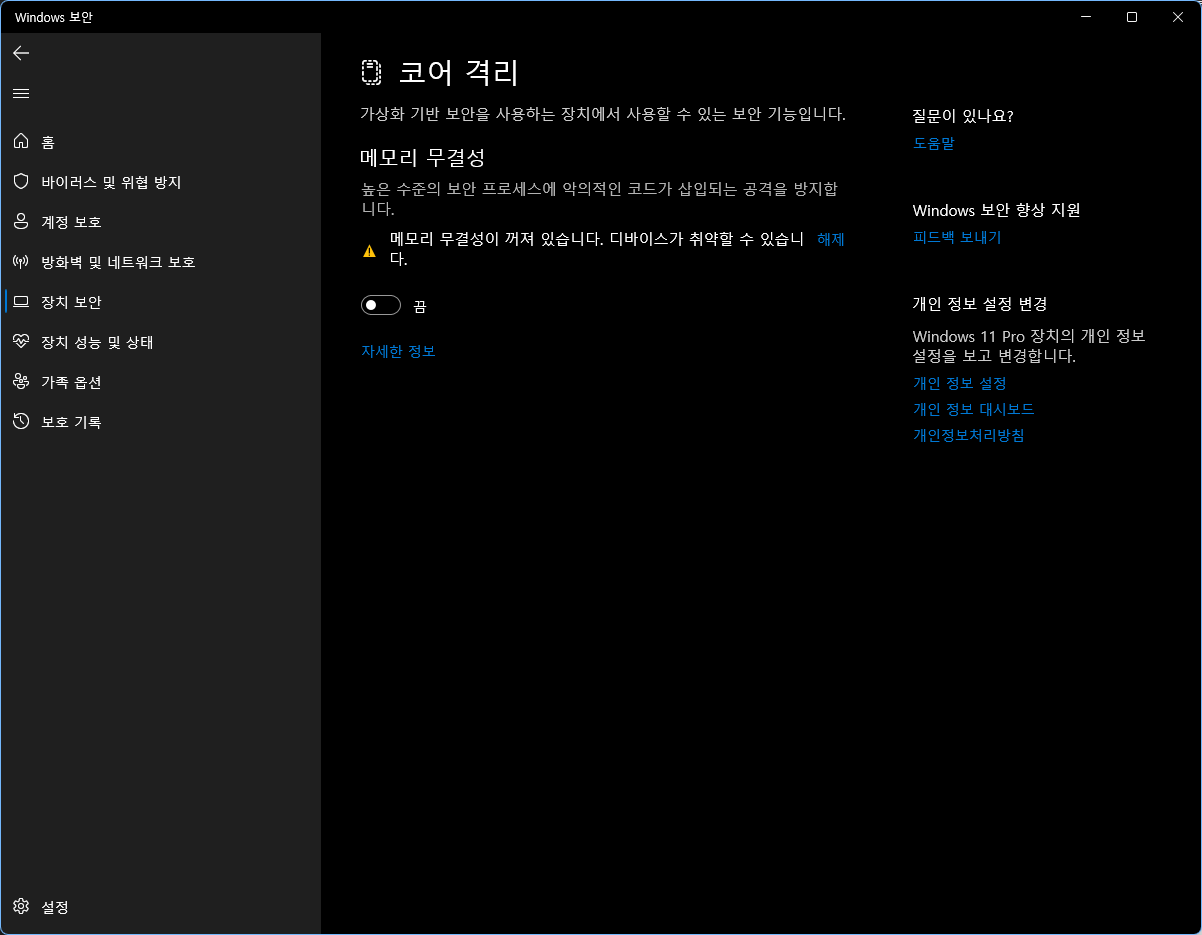 이후 다시 개인 정보 및 보안 > Windows 보안 > 코어 격리에 가서 메모리 무결성을 끄고, PC를 재시작해주면 되니 참조합시다.