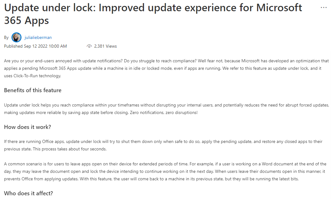 MS가 자사의 Office 365 제품군 및 Office 앱을 업데이트하기 위한 잠금 상태 업데이트 기능을 발표했습니다. 이 기능은 앱이 실행중이더라도, 장치가 유휴 상태이거나 잠금 화면으로 돌아갔을 때, 앱을 자동으로 업데이트한다고 합니다. 그렇기에 다음에 앱을 실행할 때 최신 버전으로 업데이트된 앱을 사용할 수 있다고 하네요.