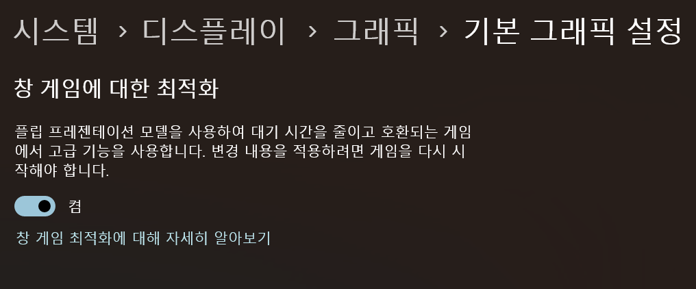 윈도11, 창 게임에 대한 최적화 2022.09.23 00:31 PC.Div.Soft/Windows.Office 반응형 윈도11 22H2에서 신규로 추가된 기능은 여러가지가 있는데, 그 중에 창 게임 최적화(DX10~11)이 포함되어 있습니다. 설정 > 시스템 > 디스플레이 > 그래픽 > 기본 그래픽 설정 > 창 게임에 대한 최적화에서 설정할 수 있습니다. 적용 후에는 시스템을 재시작할 것을 권한다고 하고, 노트북에서 이리저리 켜서 사용중 인데 별다른 문제는 없는 것 같네요. 반응형 공유하기 게시글 관리 Klein Berry 'PC.Div.Soft > Windows.Office' 카테고리의 다른 글 윈도11 22H2, 탄소 배출량 관련 업데이트 (0) 2022.09.24 윈도11 22H2, 시스템 예약 파티션 신규 생성 (0) 2022.09.23 윈도11 22H2, 디스크 상세 페이지 (0) 2022.09.23 댓글 공유하기 다른 글 댓글 이 글 공유하기 구독하기 구독하기 카카오톡 카카오톡 라인 라인 트위터 트위터 Facebook Facebook 카카오스토리 카카오스토리 밴드 밴드 네이버 블로그 네이버 블로그 Pocket Pocket Evernote Evernote 다른 글 윈도11 22H2, NVIDIA 그래픽 카드에 성능 저하 발생, 수정 윈도11 22H2, NVIDIA 그래픽 카드에 성능 저하 발생, 수정 2022.09.26 윈도11 22H2, 탄소 배출량 관련 업데이트 윈도11 22H2, 탄소 배출량 관련 업데이트 2022.09.24 윈도11 22H2, 시스템 예약 파티션 신규 생성 윈도11 22H2, 시스템 예약 파티션 신규 생성 2022.09.23 윈도11 22H2, 디스크 상세 페이지 윈도11 22H2, 디스크 상세 페이지 2022.09.23 다른 글 더 둘러보기