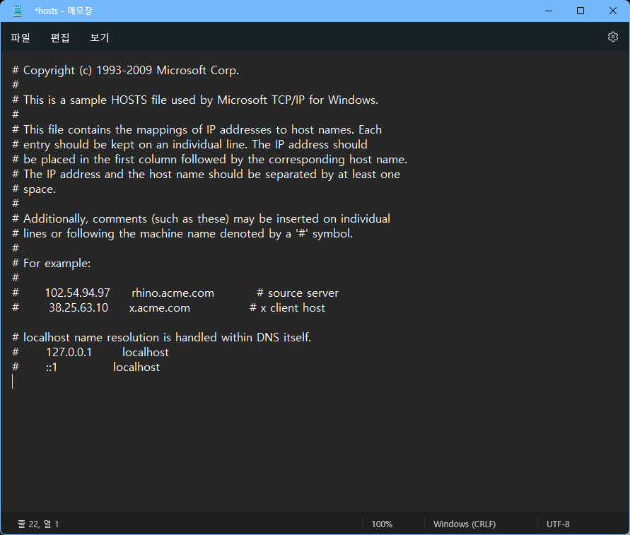 이후 메모장 등의 에디터를 열고, hosts 파일을 메모장에 드래그 앤 드롭 등으로 열어주면 다음과 같이 적혀있다.