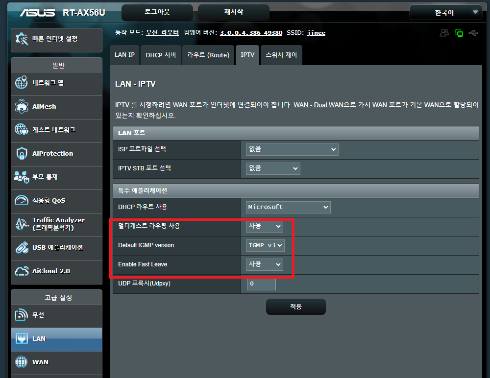 공유기에 따라 조금씩 설정이 다르긴 하겠지만, 그냥 상단의 LAN 포트 부분에서 IPTV STB 포트에서 IPTV용 포트를 별도 분리해주면(KT처럼) 별 이상없이 작동하니까 참조합시다.