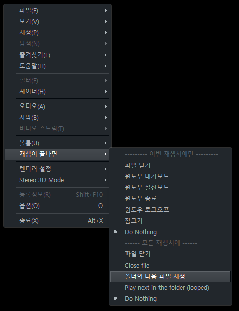 MPC 영상 계속해서 재생하기 2022.10.23 20:02 PC.Div.Soft/Tip 반응형 여러 영상 플레이어가 있겠지만, MPC를 쓴다면 우클릭 메뉴에 생각보다 뭐가 되게 많으니 챙겨보도록 합시다. 디스플레이를 해야 하거나, 영상을 여러개 쭉 틀어놓아야 하는 경우 재생 목록을 만들어도 되지만, 며칠씩 켜둬야 한다면 다음 폴더 재생을 선택해두면 되니까 참조합시다. 반응형 공유하기 게시글 관리 Klein Berry 'PC.Div.Soft > Tip' 카테고리의 다른 글 윈도11, 라이브 캡션 기능 켜기 (0) 2022.10.25 MPC 재생 화면 비율 변경하기 (0) 2022.10.23 Intel i219-V에서의 인터넷 연결 끊김 상태 완화법 (0) 2022.10.10 댓글 공유하기 다른 글 댓글 이 글 공유하기 구독하기 구독하기 카카오톡 카카오톡 라인 라인 트위터 트위터 Facebook Facebook 카카오스토리 카카오스토리 밴드 밴드 네이버 블로그 네이버 블로그 Pocket Pocket Evernote Evernote 다른 글 마우스 우클릭으로 파일 경로 복사하기 마우스 우클릭으로 파일 경로 복사하기 2022.11.28 윈도11, 라이브 캡션 기능 켜기 윈도11, 라이브 캡션 기능 켜기 2022.10.25 MPC 재생 화면 비율 변경하기 MPC 재생 화면 비율 변경하기 2022.10.23 Intel i219-V에서의 인터넷 연결 끊김 상태 완화법 Intel i219-V에서의 인터넷 연결 끊김 상태 완화법 2022.10.10 다른 글 더 둘러보기