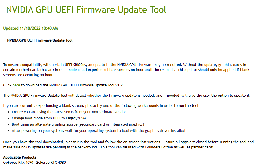 NVIDIA GPU UEFI 펌웨어 업데이트 도구 2022.12.18 03:29 PC.Div.Soft/Driver.Firmware 반응형 Geforce RTX 4090, RTX 4080용 GPU UEFI 펌웨어 업데이트 도구 v1.2 버전입니다. 특정 머더보드와의 호환성을 개선하는 도구이며, 부팅 시 OS가 로드되기 전까지 화면에 아무것도 표시되지 않는 경우에만 업데이트를 적용할 것을 권하니 참조하세요. 반응형 공유하기 게시글 관리 Klein Berry 'PC.Div.Soft > Driver.Firmware' 카테고리의 다른 글 HP 15 노트북 PC 15-e3000(4X377AV) BIOS 업데이트 (0) 2022.12.25 ASUS TUF GAMING B550M-PLUS BIOS 업데이트(2806) (0) 2022.12.13 Creative Sound Blaster 업데이트 소식 (0) 2022.12.12 댓글 공유하기 다른 글 댓글 이 글 공유하기 구독하기 구독하기 카카오톡 카카오톡 라인 라인 트위터 트위터 Facebook Facebook 카카오스토리 카카오스토리 밴드 밴드 네이버 블로그 네이버 블로그 Pocket Pocket Evernote Evernote 다른 글 서피스 드라이버/펌웨어 지원 기간 서피스 드라이버/펌웨어 지원 기간 2022.12.29 HP 15 노트북 PC 15-e3000(4X377AV) BIOS 업데이트 HP 15 노트북 PC 15-e3000(4X377AV) BIOS 업데이트 2022.12.25 ASUS TUF GAMING B550M-PLUS BIOS 업데이트(2806) ASUS TUF GAMING B550M-PLUS BIOS 업데이트(2806) 2022.12.13 Creative Sound Blaster 업데이트 소식 Creative Sound Blaster 업데이트 소식 2022.12.12 다른 글 더 둘러보기