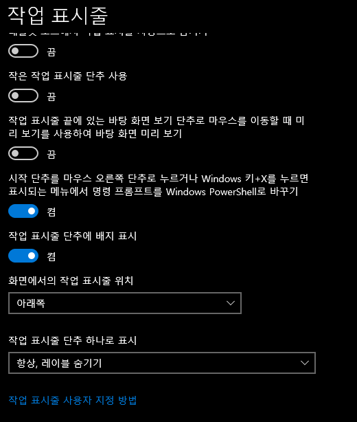 윈도10 작업 표시줄 레이블(이름) 표시 2022.12.29 10:35 PC.Div.Soft/Windows.Office 반응형 윈도11에서는 아쉽게도 동작하지 않는다. 각종 태스크바 프로그램의 힘을 빌리지 않는 한 그냥 덩그러니 아이콘으로만 떠다니게 되니 참조합시다. 윈도10의 경우 설정 > 개인 설정 > 작업 표시줄에서 가능하니 설정해서 사용합시다. 반응형 공유하기 게시글 관리 Klein Berry 'PC.Div.Soft > Windows.Office' 카테고리의 다른 글 Windows 11에서 SMB2/SMB3 게스트 액세스 기본 비활성화 (0) 2023.01.15 디스크 관리에서 팩 이름이 잘못되었습니다 오류 나올 때 (0) 2022.12.20 윈도 재설치로 윈도 업데이트 문제 해결하기 (0) 2022.12.18 댓글 공유하기 다른 글 댓글 이 글 공유하기 구독하기 구독하기 카카오톡 카카오톡 라인 라인 트위터 트위터 Facebook Facebook 카카오스토리 카카오스토리 밴드 밴드 네이버 블로그 네이버 블로그 Pocket Pocket Evernote Evernote 다른 글 탐색기에서 명령창 쉽게 열기 탐색기에서 명령창 쉽게 열기 2023.01.16 Windows 11에서 SMB2/SMB3 게스트 액세스 기본 비활성화 Windows 11에서 SMB2/SMB3 게스트 액세스 기본 비활성화 2023.01.15 디스크 관리에서 팩 이름이 잘못되었습니다 오류 나올 때 디스크 관리에서 팩 이름이 잘못되었습니다 오류 나올 때 2022.12.20 윈도 재설치로 윈도 업데이트 문제 해결하기 윈도 재설치로 윈도 업데이트 문제 해결하기 2022.12.18 다른 글 더 둘러보기