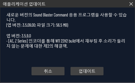 SB COMMAND 소프트웨어 업데이트 2023.01.16 22:02 PC.Div.Soft/News 반응형 Sound Blaster Command의 신규 앱 업데이트가 진행되었습니다. AE, Z시리즈의 Win11 22H2와의 특정 문제를 해결한 버전이라고 하니 사용하시는 분들은 앱 내 업데이트를 확인해보세요. 버전은 3.5.09입니다. 반응형 공유하기 게시글 관리 Klein Berry 'PC.Div.Soft > News' 카테고리의 다른 글 CAMM: 새로운 노트북 메모리 표준 (0) 2023.01.18 AMD, AGESA 1.0.0.4 펌웨어 버그 수정 (0) 2023.01.16 다이렉트 스토리지(Direct Storage) 성능 비교 (0) 2023.01.16 댓글 공유하기 다른 글 댓글 이 글 공유하기 구독하기 구독하기 카카오톡 카카오톡 라인 라인 트위터 트위터 Facebook Facebook 카카오스토리 카카오스토리 밴드 밴드 네이버 블로그 네이버 블로그 Pocket Pocket Evernote Evernote 다른 글 인텔 i226-V 2.5GbE의 이더넷 끊김 문제 인텔 i226-V 2.5GbE의 이더넷 끊김 문제 2023.01.22 CAMM: 새로운 노트북 메모리 표준 CAMM: 새로운 노트북 메모리 표준 2023.01.18 AMD, AGESA 1.0.0.4 펌웨어 버그 수정 AMD, AGESA 1.0.0.4 펌웨어 버그 수정 2023.01.16 다이렉트 스토리지(Direct Storage) 성능 비교 다이렉트 스토리지(Direct Storage) 성능 비교 2023.01.16 다른 글 더 둘러보기