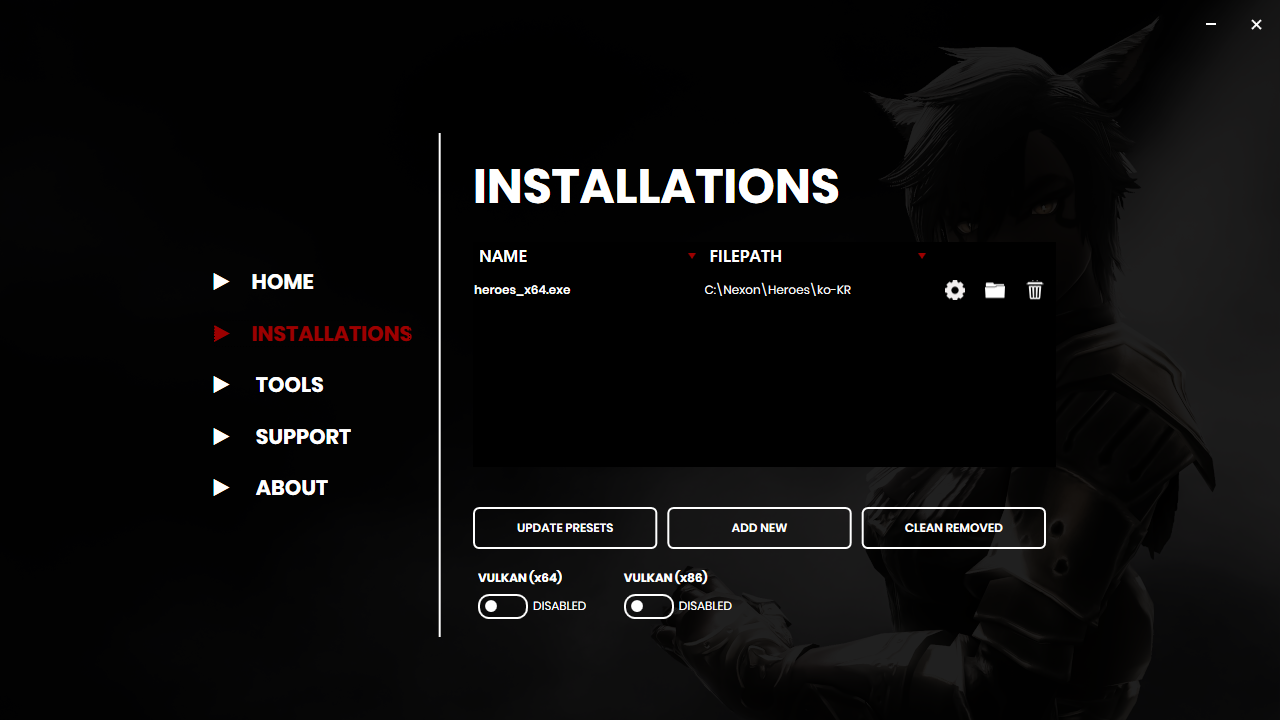마영전 기준으로 보면 64bit클라이언트 사용한다고 했을 때, .exe파일 선택하기(기본 경로는 C:\Nexon\Heroes\ko-KR\heroes_x64.exe, 64bit, DX11, 후킹 노멀 선택하면 됨. 처음 설치할 때 한국어로 설명해주고, 첫 실행하면 나오는 튜토리얼 기준으로 콘솔 열고 닫는 키는 쉬프트 + 백스페이스키고, 옵션을 조절하려면 마우스 커서가 있어야 하니 ESC를 한 번 눌러둔 상태에서 콘솔을 열도록 합시다.