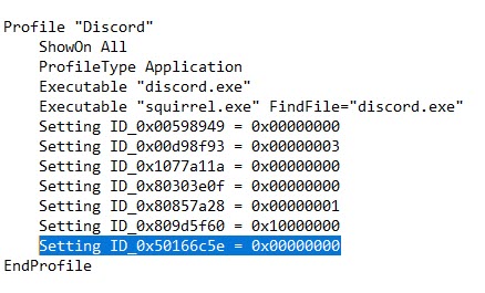 이후 메모장 등으로 위에서 저장한 텍스트 파일을 연 뒤, Discord 섹션까지 가서 Setting ID_0x50166c5e = 0x00000000 행을 추가한 뒤저장하라고 합니다. 그 후 위 프로파일 매니져 프로그램으로 SLI 프로파일을 가져오면(Import SLI Profiles)된다고 하네요.