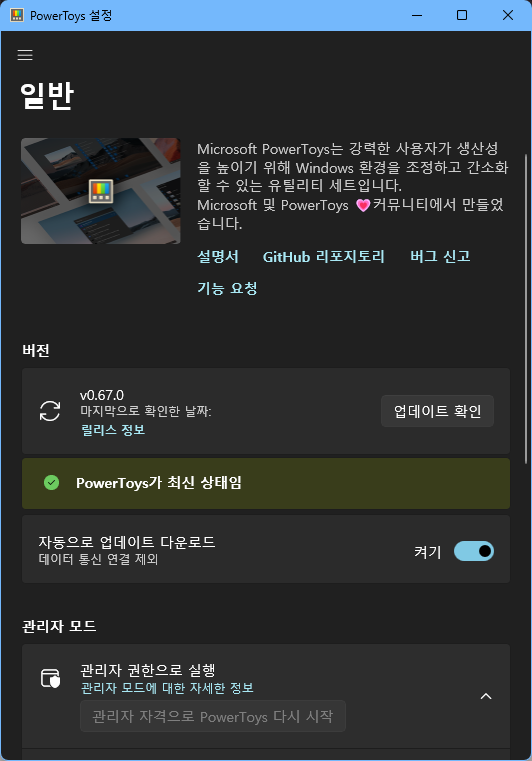 PowerTyos 0.67.0 출시, 런처 적용 등 업데이트 2023.02.02 21:50 PC.Div.Soft/Windows.Office 반응형 PowerToys 0.67.0 버전이 출시되었습니다. 업데이트 확인하는 데 조금 시간이 걸리는데, 업데이트가 진행되네요. 이번 업데이트에서 트레이 아이콘을 누르면 컨텍스트 메뉴 대신 큰 아이콘으로 실행할 수 있게 되었고, 레지스트리가 장치(전체 시스템)에서 사용자 단위로 변경되었다고 합니다. 반응형 공유하기 게시글 관리 Klein Berry 'PC.Div.Soft > Windows.Office' 카테고리의 다른 글 Microsoft PC Manager 베타, PC 관리 프로그램 (0) 2023.02.04 Microsoft, 웹에서 Execl추가 기능 다운로드 차단 예정 (0) 2023.01.30 윈도11, KB5022360 업데이트 프리뷰 제공 (0) 2023.01.29 댓글 공유하기 다른 글 댓글 이 글 공유하기 구독하기 구독하기 카카오톡 카카오톡 라인 라인 트위터 트위터 Facebook Facebook 카카오스토리 카카오스토리 밴드 밴드 네이버 블로그 네이버 블로그 Pocket Pocket Evernote Evernote 다른 글 윈도 오늘의 배경화면 저장 방법 윈도 오늘의 배경화면 저장 방법 2023.02.04 Microsoft PC Manager 베타, PC 관리 프로그램 Microsoft PC Manager 베타, PC 관리 프로그램 2023.02.04 Microsoft, 웹에서 Execl추가 기능 다운로드 차단 예정 Microsoft, 웹에서 Execl추가 기능 다운로드 차단 예정 2023.01.30 윈도11, KB5022360 업데이트 프리뷰 제공 윈도11, KB5022360 업데이트 프리뷰 제공 2023.01.29 다른 글 더 둘러보기