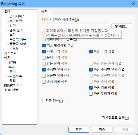 Everything, 갑자기 검색이 잘 안될때 2023.02.09 22:42 Web.World/Trivia 반응형 Everything을 잘 쓰고 있는데, 어느날 네트워크 드라이브 추가하고, 서버 추가해서 검색해서 쓰고 하다 갑자기 애스터리스크(*)를 사용한 검색이 안되는 경우가 생겨서 이리저리 해보다 발견. 설정 > 색인에서 데이터베이스 저장경로를 따로 지정하고, 지금 갱신(F)를 눌러 데이터베이스를 새로 구축해주면 올바르게 작동하니 참조합시다. 반응형 공유하기 게시글 관리 Klein Berry 'Web.World > Trivia' 카테고리의 다른 글 알리) 스마트폰용 마그네틱 스티커 (0) 2023.02.12 알리)원신 아크릴 스탠드 (0) 2023.02.09 Intel Alderlake N95를 탑재한 미니PC 알리 등장 (0) 2023.02.08 댓글 공유하기 다른 글 댓글 이 글 공유하기 구독하기 구독하기 카카오톡 카카오톡 라인 라인 트위터 트위터 Facebook Facebook 카카오스토리 카카오스토리 밴드 밴드 네이버 블로그 네이버 블로그 Pocket Pocket Evernote Evernote 다른 글 알리)스마트폰 전면 카메라/웹캠 커버 알리)스마트폰 전면 카메라/웹캠 커버 2023.02.12 알리) 스마트폰용 마그네틱 스티커 알리) 스마트폰용 마그네틱 스티커 2023.02.12 알리)원신 아크릴 스탠드 알리)원신 아크릴 스탠드 2023.02.09 Intel Alderlake N95를 탑재한 미니PC 알리 등장 Intel Alderlake N95를 탑재한 미니PC 알리 등장 2023.02.08 다른 글 더 둘러보기