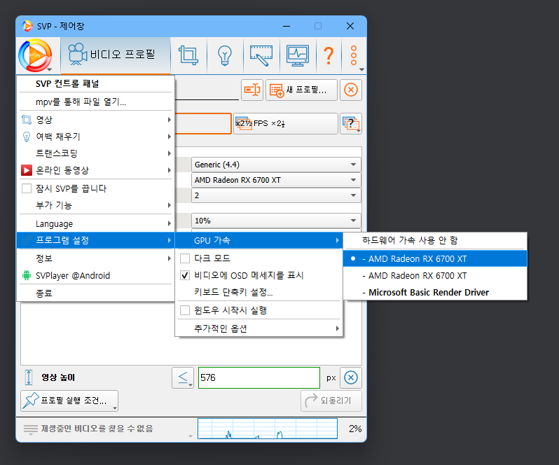 SVP 제어창을 열고, SVP 아이콘 > 프로그램 설정 > GPU 가속 > 부분에서 기본값이 Microsoft Basic Render Driver에 체크되어 있는 경우라면 이걸 자기가 사용하는 올바른 그래픽 카드로 선택해주면 재생이 올바르게 되니 참조합시다.